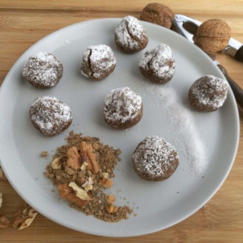 Former des boules de 20g. Les pincer un peu pour donner une jolie forme. Saupoudrer de sucre glace et poser sur une plaque recouverte de papier sulfurisé. Laisser sécher la nuit.