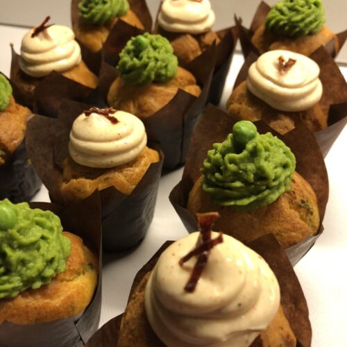 Dresser des rosettes sur la moitié des cupcakes à l'aide d'une poche à douille. Décorer avec un petit pois.