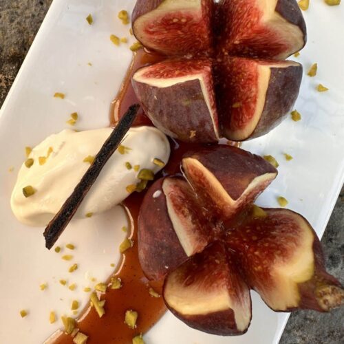 Mélanger dans une petite casserole le beurre, le miel, la crème de balsamique et le 1/4 de gousse de vanille coupée en 2. Ajouter les figues et mijoter pendant 3 minutes.
