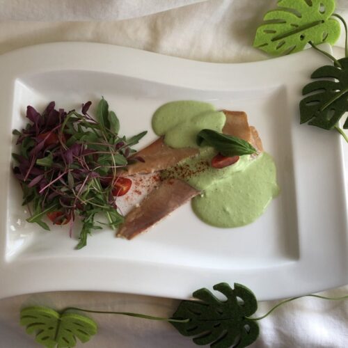 Mettre la crème fraîche, les feuilles de basilic, le Maggi et le Tabasco dans un récipient et passer au bamix jusqu’à obtention d’une crème semi-épaisse
