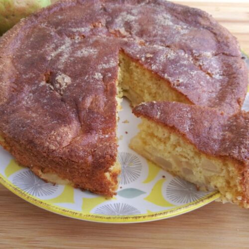 Travailler les œufs et le sucre jusqu'à ce que cela blanchisse. Ajouter le mélange farine – poudre à lever, en dernier, les poires émincées. Verser dans le moule garni de papier