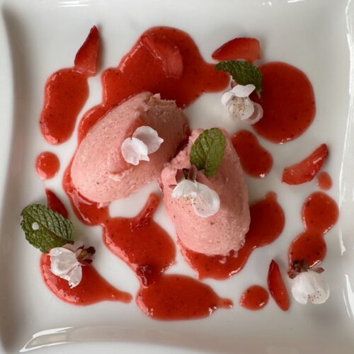 Verser le coulis sur le fond des assiettes, former des quenelles avec la mousse et décorer avec les éléments de saison.