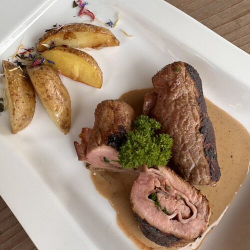 Poser par-dessus une fine tranche de jambon et répartir la farce aux herbes. Enrouler et fixer à l’aide de cure-dents.