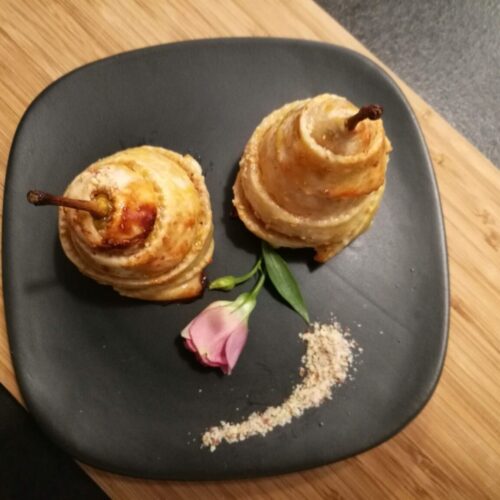 Badigeonner les poires avec la confiture et enrouler les poires avec les lamelles de pâte en commençant vers la tige.