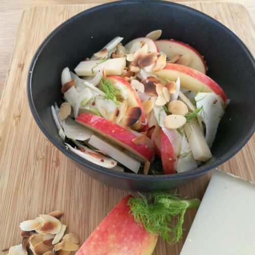 Salade : mélanger les fenouils, les pommes et le fromage à la sauce.