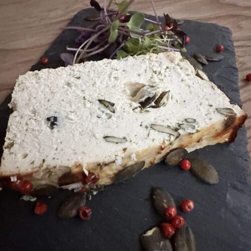 Verser la masse dans un moule en aluminium, ajouter les graines de courge et mélanger. Lisser la masse. Parsemer de baies roses et de graines de courge.